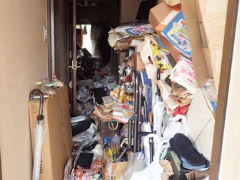 電気が通っていなかった為室内はかなり暗く、玄関から居室の奥まで床が見えないほど物で溢れていました。