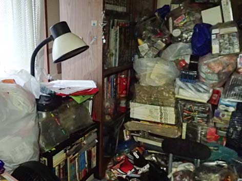 部屋は全体に本や雑誌が積まれており、CDやチラシ類が散らばって床が見えない状態でした。