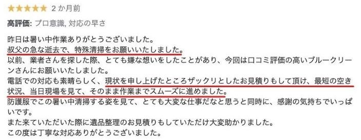 今回は、遺品整理も行っている私たちブルークリーンに寄せられた3件の口コミを例に確認してみましょう。