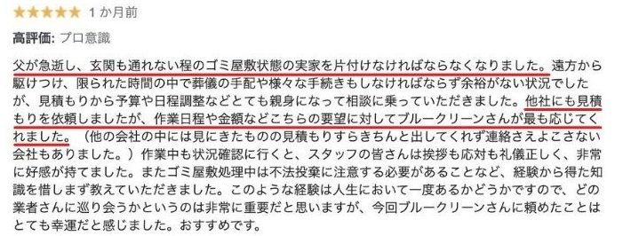 「他社にも見積もりを依頼したが、こちらの要望に対してブルークリーンが最も応じてくれた」という口コミです。